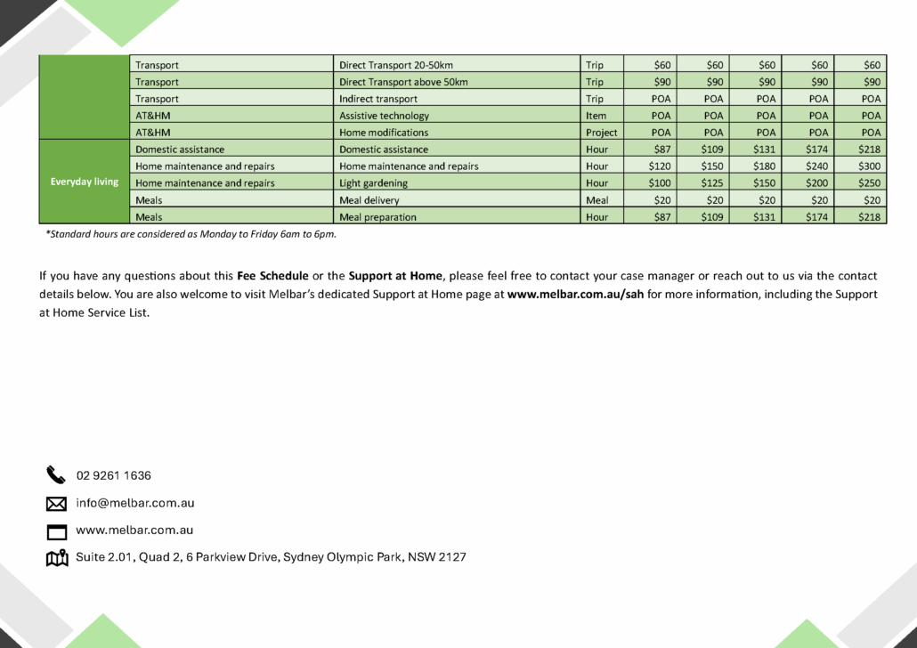 Melbar Sydney Fee Schedule