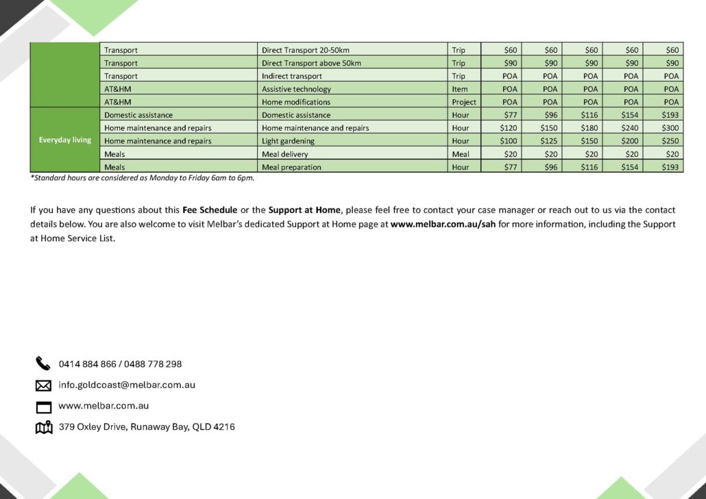 Melbar Gold Coast Fee Schedule