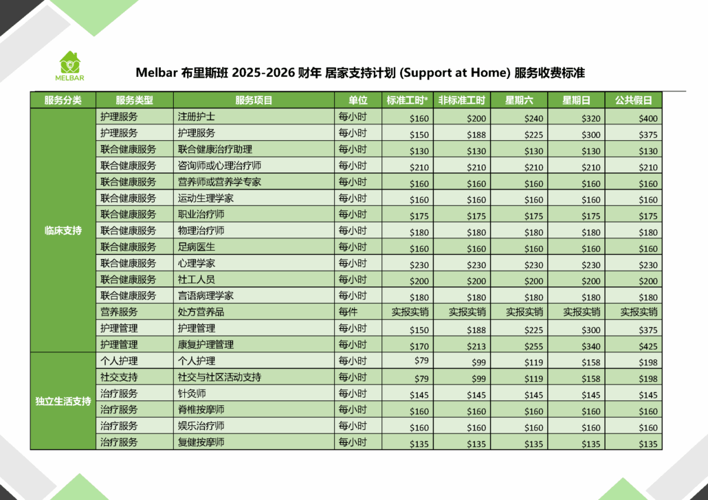 Melbar服务收费标准 - 布里斯班