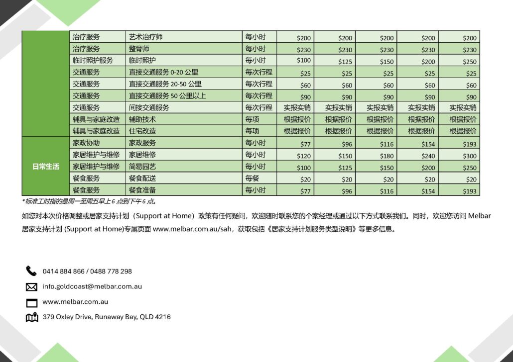 Melbar服务收费标准 - 黄金海岸